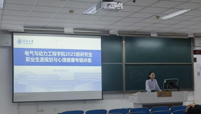 姜莉老师以《“电”亮学涯,“动”驱未来——研究生阶段的职业能力发展与建构》为题,从“乌卡(VUCA)时代”的职业新生态切入,系统剖析当前就业市场的易变性、不确定性、复杂性与模糊性四大特征。在此基础上,她鼓励同学们一方面深耕专业能力,另一方面培养受益终身的跨领域解决问题能力,逐步构建以“省察力、选择力、认同力”为核心的元能力体系。