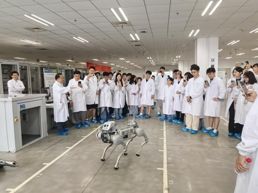 随后,同学们按要求穿戴好静电防护服,深入南瑞继保的自动化生产车间和研发测试区域进行参观。高度智能化的产线、严谨有序的工艺流程让同学们叹为观止。工作人员重点介绍了如“柔性直流输电”等代表世界顶尖技术水平的重大工程项目,也介绍了智能机械狗在内的前沿智能化产品的研发与应用场景。这场“零距离”的接触,让书本上的理论知识与鲜活的工业实践实现了深度融合。